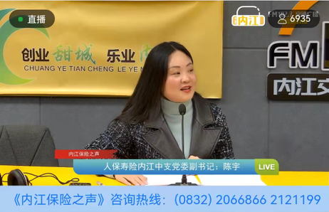11月11日下午17:00,中国人民人寿保险股份有限公司内江中心支公司党委副书记(主持工作)陈宇作客FM102.7内江交通广播“内江保险之声”栏目第二十七期直播间,与听众朋友们交流“养老保障体系及个人养老金政策”。