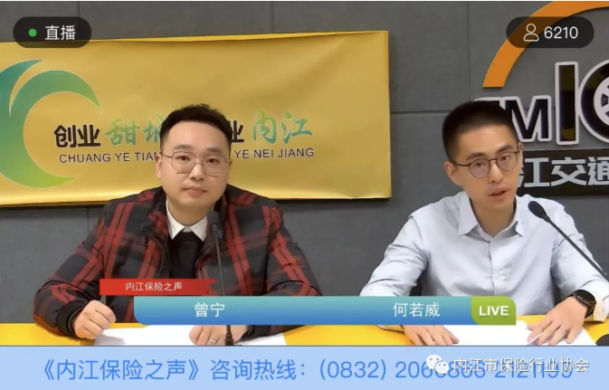 11月30日,内江市保险行业协会车险专业委员会副主任、平安产险内江中心支公司副总经理何若威,中国太平洋财产保险股份有限公司内江中心支公司理赔经理曾宁,应邀做客FM102.7内江交通广播“内江保险之声”栏目第三十二期直播间,与广大听众畅谈车险承保和理赔的相关问题。