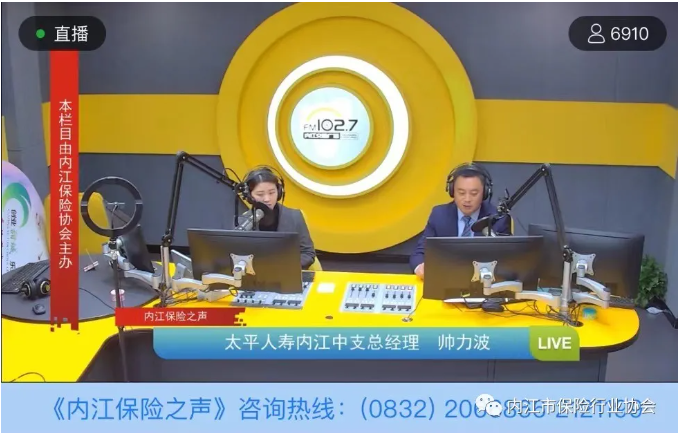 12月2日,太平人寿保险有限公司内江中心支公司总经理帅力波第二次做客FM102.7内江交通广播“内江保险之声”栏目第三十三期直播间,向内江老百姓传递保险理念,宣传保险知识。