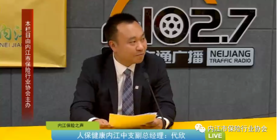 2022年3月24日下午17:00,中国人民健康保险股份有限公司内江中心支公司副总经理代欣做客FM102.7内江交通广播“内江保险之声”栏目第六十三期直播间,与大家分享健康保险相关知识。