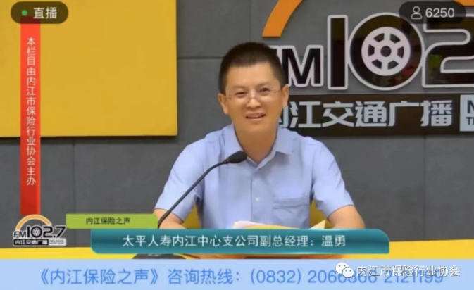 7月28日,太平人寿保险有限公司内江中心支公司副总经理温勇做客FM102.7内江交通广播“内江保险之声”栏目第九十六期直播间,向内江老百姓传递保险理念,宣传保险知识。