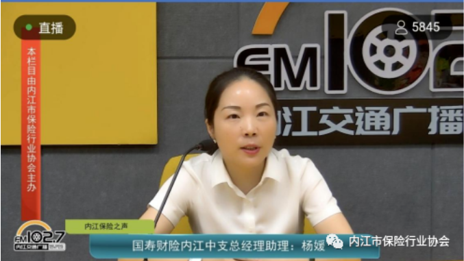7月26日,中国人寿财产保险股份有限公司内江市中心支公司总经理助理杨媛做客FM102.7内江交通广播“内江保险之声”栏目第九十五期直播间,与大家交流分享“浅谈保险在经济社会中的意义与功用”相关内容。
