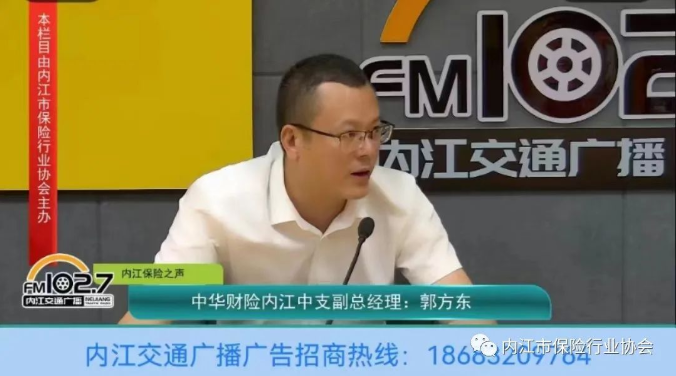 9月8日,中华联合财产保险股份有限公司内江中心支公司副总经理郭方东做客FM102.7内江交通广播“内江保险之声”栏目第一百零八期直播间,与大家交流分享内江市保险业助力抗旱减灾的情况。