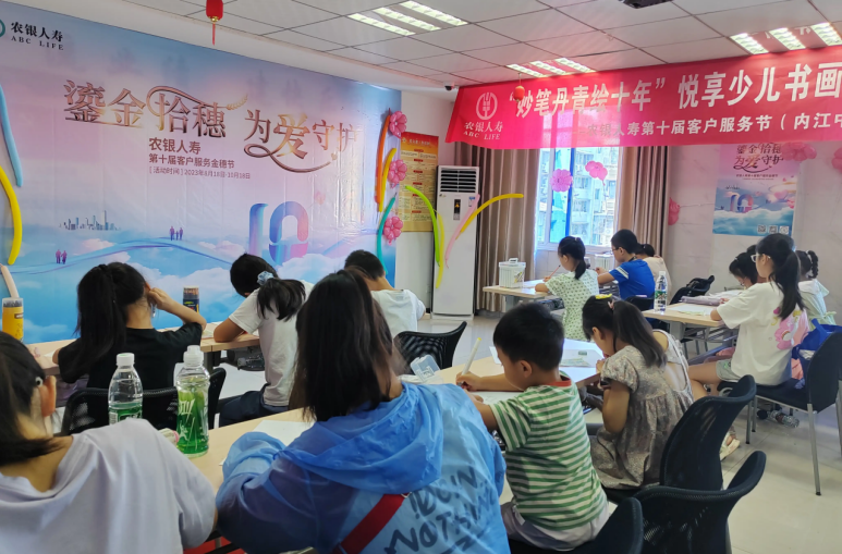 2023年9月3日,金秋时节,丹桂飘香,风清气爽,正值农银人寿第十届客户服务金穗节,农银人寿内江中支以“鎏金拾穗 为爱守护”为主题,围绕“十年感恩回馈,共享美好新生活”为主线,邀请小朋友参加“ 妙笔丹青绘十年 ”悦享少儿书画比赛,给孩子们创造一个才艺展示的平台,更好的贴近生活,丰富生活,充盈情感,让每个孩子内心播散爱的种子,孕育出更多艺术之花!