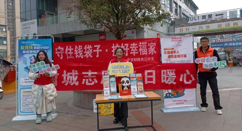 为践行金融机构社会责任,筑牢县域金融安全防线,1月28日,平安财险资中支公司组织志愿者团队走进资中县汇金天地商圈,开展“守住钱袋子 护好幸福家”主题宣传活动,为商圈商户、营业员及过往居民送上实用的反洗钱与防范金融诈骗知识。