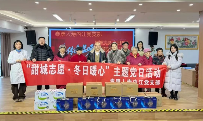 为积极响应内江金融监管分局关于开展“甜城志愿·冬日暖心”系列活动的号召,深入贯彻市委八届十次全会精神,践行企业社会责任,2026年2月9日上午,泰康人寿内江中支总经理罗杰率党支部党员前往内江福寿悦禧养老中心开展慰问活动,为老人们送去新春祝福和暖心物资。